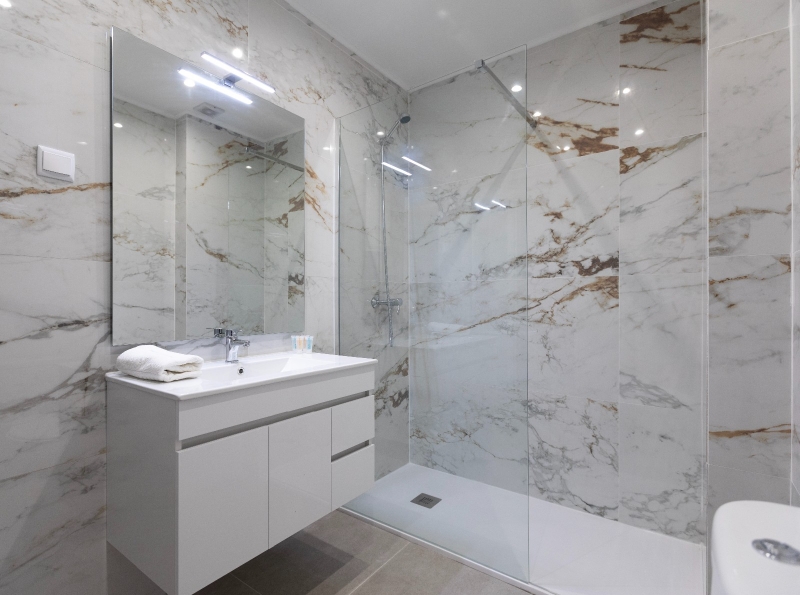 The brand-new bathroom is spotless and sophisticated, perfect for recharging after a day in the sun.